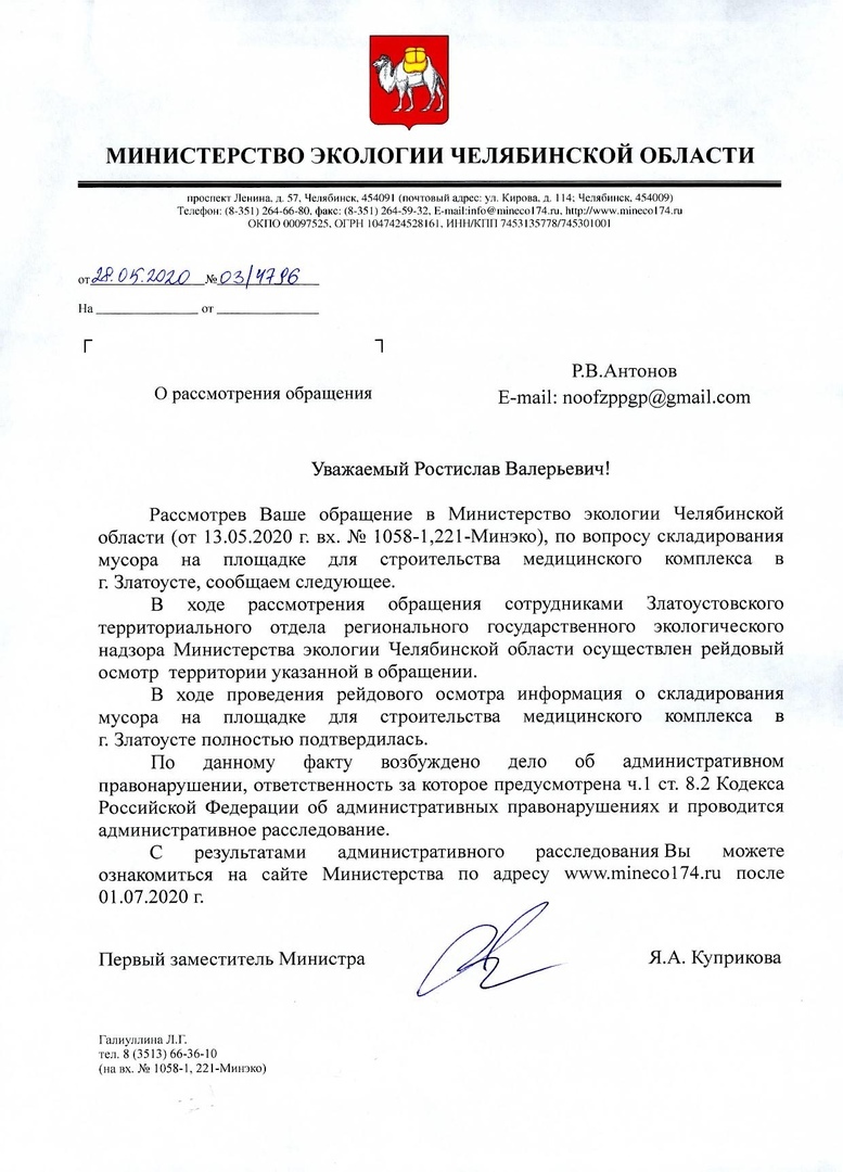 Результаты административного расследования будут опубликованы после 1.07.2020 г. на сайте Минэкологии Челябинской области.