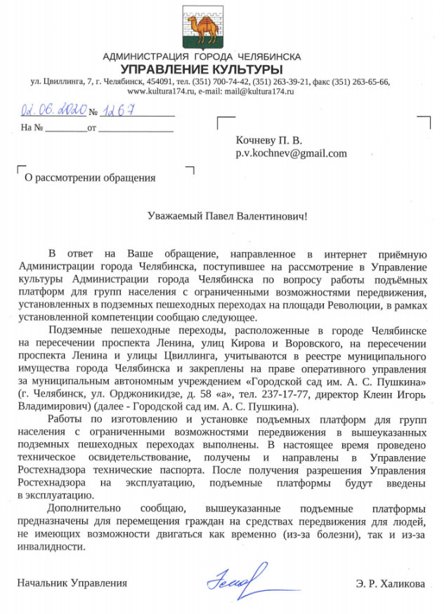 Житель Челябинска Павел Кочнев отправил обращение в интернет приёмную Администрации г. Челябинск. Он хотел узнать, когда заработают подъёмные платформы в подземных переходах в центре города.