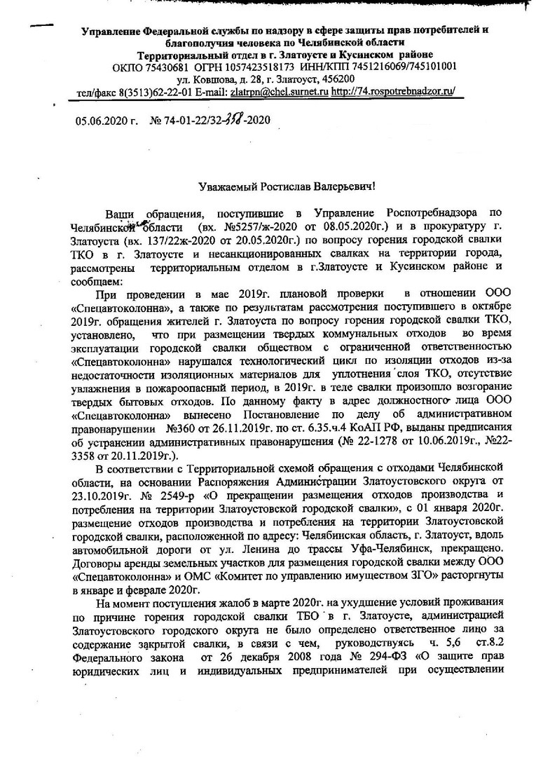 Нарушения арендатора — компании «Спецавтоколонна» привели к возгоранию. На мусорном полигоне не производилась промежуточная изоляция уплотненных слоев твердых коммунальных отходов. Это и привело к возгоранию, сообщил общественникам заместитель главы Златоуста Вячеслав Бобылев.