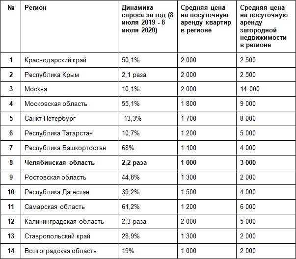 Эксперты составили рейтинг топ-20 направлений наиболее популярных у россиян этим летом. Челябинская область заняла восьмое место, где в среднем посуточно можно арендовать квартиру за одну тысячу рублей, а загородную недвижимость — примерно за 3 тыс. руб.