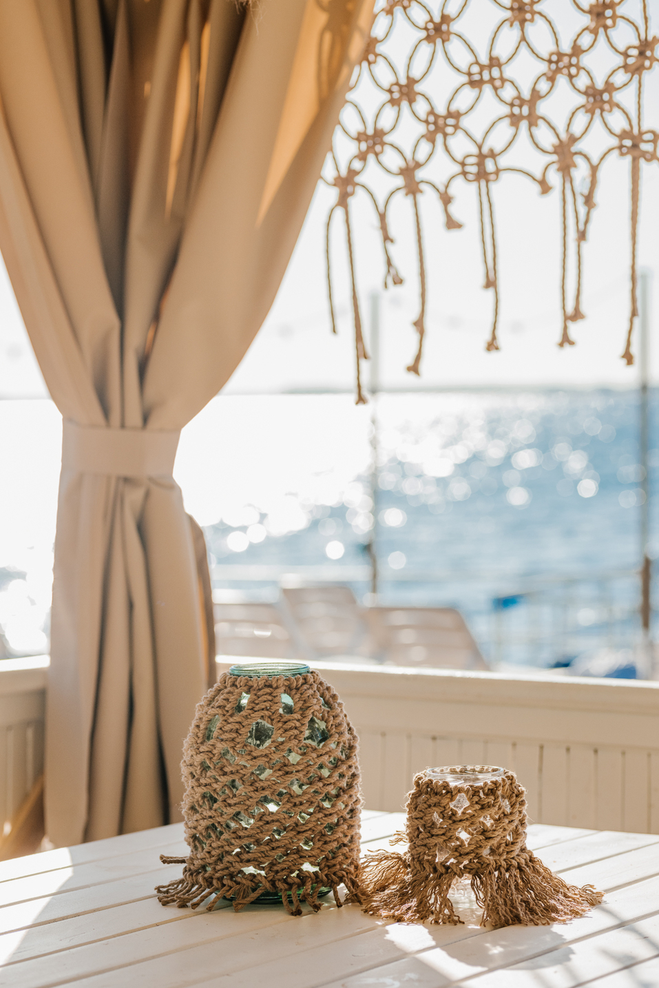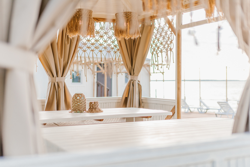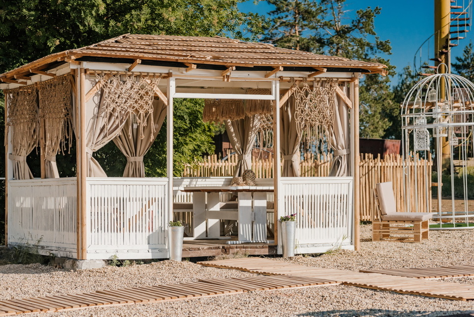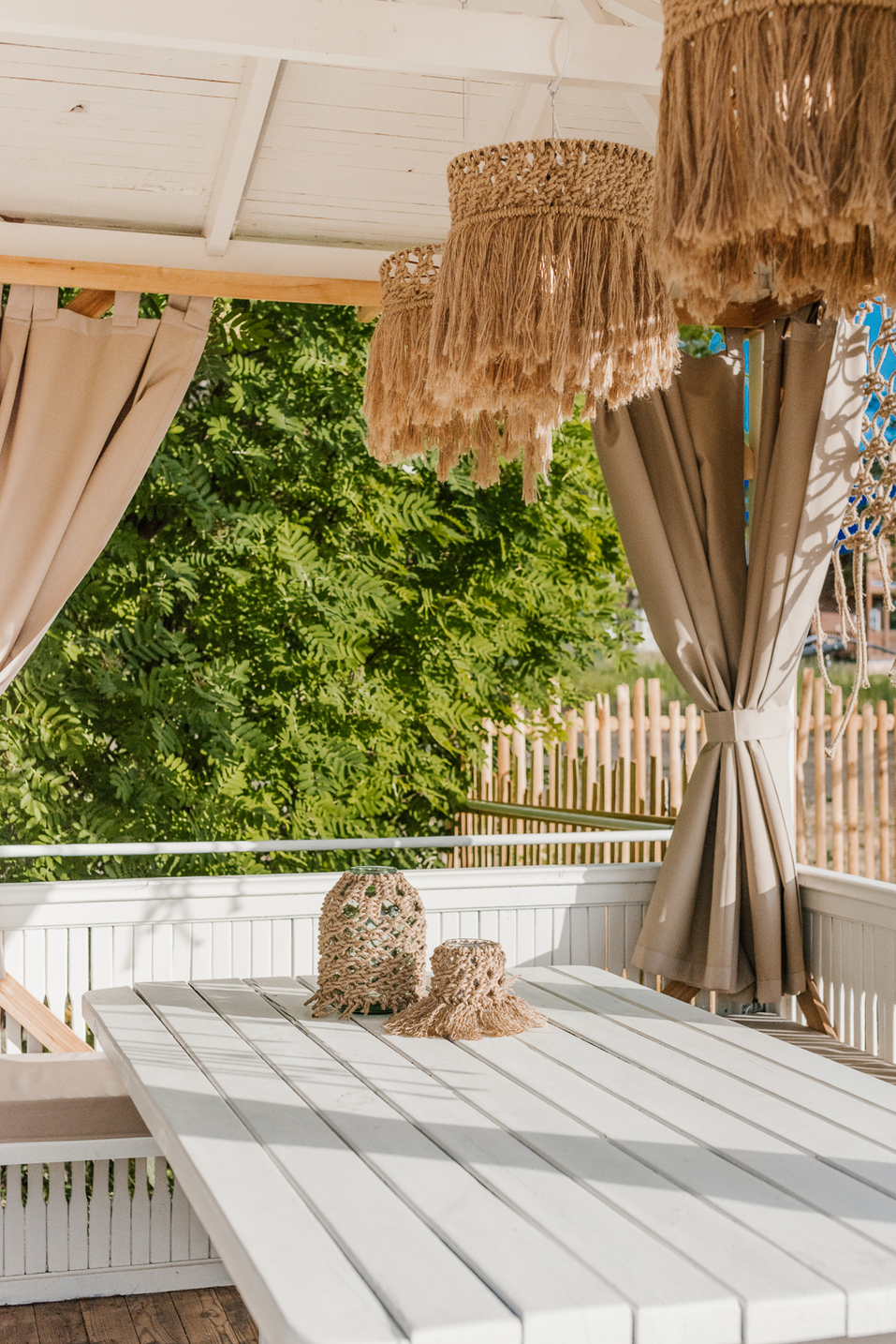 Очень многое дизайнер делала собственноручно: плела макраме для абажуров и декоративных элементов для беседок, снимала старое покрытие со столов, перекрашивала их из потемневшего коричнего в белоснежный.