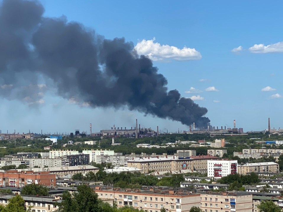 В промзоне Калининского района разгорелся пожар, чёрный дым от которого видно по всему городу. Известно, что горит производственный цех с нефтепродуктами.