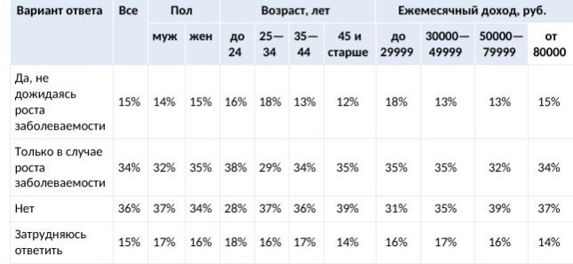 «Более трети опрошенных считает, что подобный режим нужно вводить только в случае роста заболеваемости коронавирусом (34%). По мнению 15% респондентов режим всеобщей самоизоляции необходимо будет ввести, не дожидаясь увеличения числа заболевших», — сообщают аналитики.