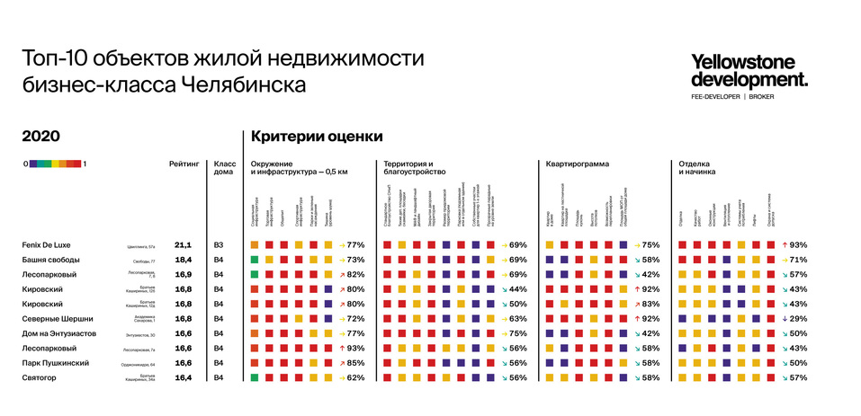 Рейтинг жилой недвижимости комфорт- и бизнес-класса Челябинска подготовили аналитики Yellowstone development специально для CHEL.DK.RU. Рейтинг составлен по специально разработанной методике, в основе которой лежит применение наиболее распространенной классификации жилой недвижимости – «Единой классификации многоквартирных жилых новостроек», предложенной федеральным Фондом содействия развитию жилищного строительства и Российской гильдией риелторов. «Предлагаемая классификация служит инструментом качественной оценки объектов на рынке жилой недвижимости, отличной и дополнительной к такому критерию как цена», - отмечает директор Yellowstone development Денис Ни.