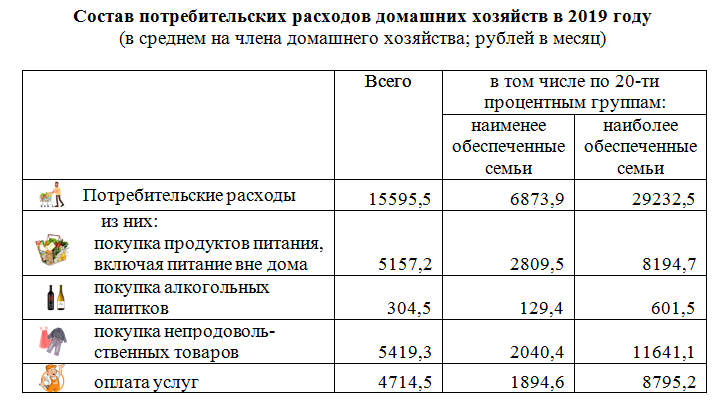 Стоит отметить, что есть существенные отличия по затратам между семьями с разным уровнем дохода. Наиболее обеспеченные семьи в среднем в месяц в 5,7 раза больше тратят на непродовольственные товары , чем семьи с наименьшими доходами. В 4,6 раза меньше семьи с низким ежемесячным доходом тратят на оплату услуг и на покупку алкогольных напитков. А на покупку продуктов питания и питание вне дома — в 2,9 раза больше тратят семьи с высокими доходами.