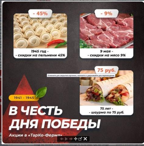 В Челябинске управление антимонопольной службы признало недопустимой рекламу магнитогорской сети магазинов мясных изделий «Тарко-Ферма». На баннерах компания написала: «1941-1945 гг. Скидка на пельмени 45%, 9 мая – скидка на мясо 9%, 75 лет — шаурма по 75 руб.». Изображения распространялись в интернете.