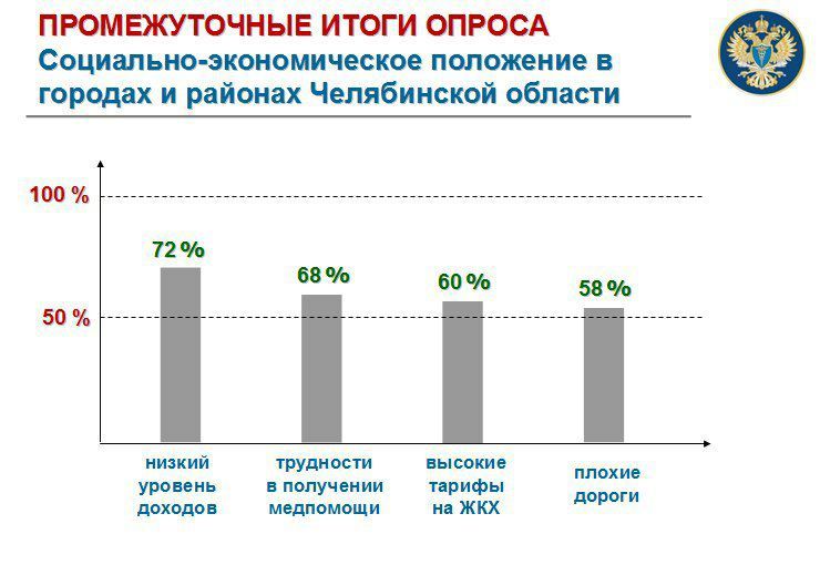 Также многие южноуральцы (68%) возмущены трудностями в получении медицинской помощи. Высокие тарифы ЖКХ не устраивают 60% опрошенных, а плохие дороги упомянули 58%.