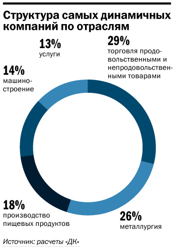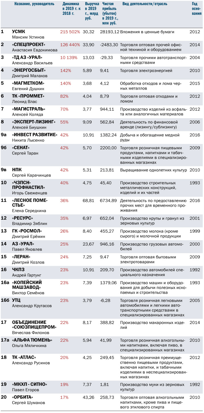 Лидером по темпам прироста стала «Урало-сибирская металлургическая компания», занимающаяся вложением в ценные бумаги. За год выручка компании выросла на 215 502% до 30,3 млрд руб. На втором месте компания «Спецпроект», торгующая офисной техникой и оборудованием, с динамикой выручки в 126 440% до 33,9 млрд руб. На 10 139% до 23,67 млрд руб. приросла выручка Торгового дома автозавода «Урал».
