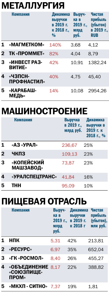 «Копейский машиностроительный завод» за 2019 г. увеличил выручку на 23% до 73,87 млрд руб. «ЧТЗ-Уралтрак», «НПО «Электромашина» даже не вошли в Топ-100. Самую серьезную динамику показал АЗ «Урал»: выручка выросла на 23% до 236,5 млрд руб. На втором месте – ЧКПЗ с приростом в 23% до 109,13 млрд руб. и «Копейский машзавод», выручка которого увеличилась до 73,87 млрд руб.