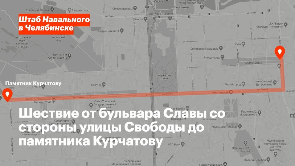 После начала акции — она назначена на субботу, 23 января, в 14:00 — митингующие двинутся колонной на проспект Ленина. Далее они повернут направо и планируют проследовать по главной улице Челябинска до ее окончания на площади перед памятником Курчатова. Маршрут активисты опубликовали в сообществе мероприятия во «ВКонтакте».