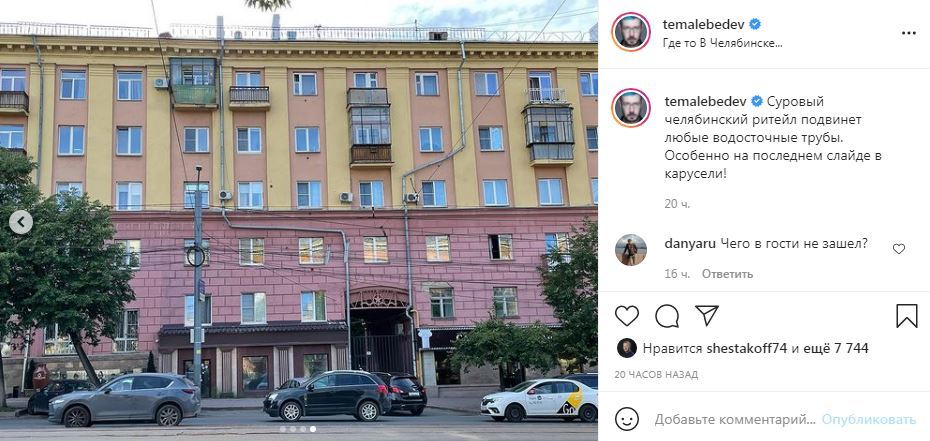 Основатель и руководитель «Студии Артемия Лебедева» приехал в Челябинск накануне, 7 июля из Екатеринбурга. Прогулявшись по центру города, он сделал на своей странице в Instagram две публикации, посвященных городу. В первой он удивился тому, как местные торговцы обращаются с водосточными трубами: