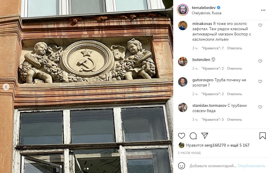 Второй пост он посвятил фотографиям скульптурных украшений в стилистике «сталинского ампира» на жилых домах по улицам Цвиллинга и Советской. «Челяба!», — коротко подписал Лебедев второй фотоотчет.